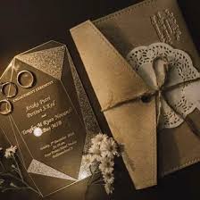 Undangan berbahan akrilik juga bisa menjadi pilihan kamu di hari spesial kamu. Undangan ini berbahan dasar dari material clear acrylic. Dengan memilih undangan berbahan akrilik kamu bisa sekaligus memilih grafik tulisan yang berwarna gold agar memberikan kesan eksklusif dan mewah.